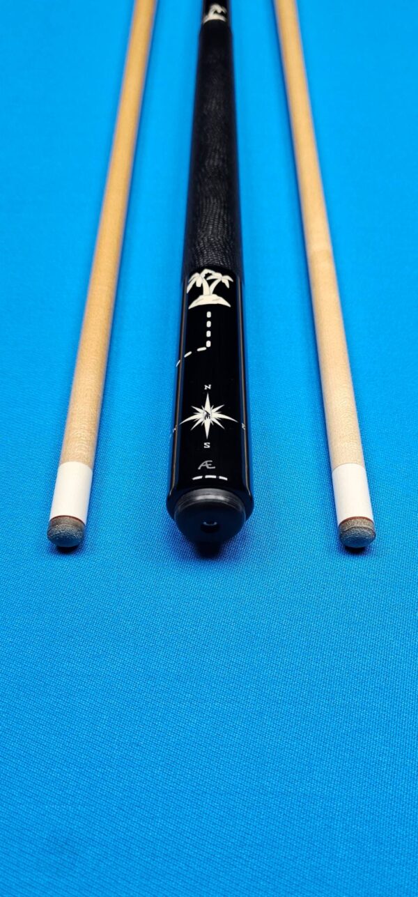 - The old treasure maps I remember seeing always had pictures and land marks with dotted lines leading up to the spot where an X marked the spot of the buried treasure. I came up with a variety of things to inlay into the cue. The map starts in the butt with a compass so you won’t get lost. From there you follow the dotted lines to a deck cannon, past a crab to a deserted island with a couple of palm trees. From there you sail across the sea (leather wrap) to another deserted island with a palm tree. You continue the quest to a lighthouse, past a whale (possibly Moby Dick) sailing along in your 3 mast pirate ship flying the cross bones. You continue to sail along past Jeff the Tuna and end up at the promised X which marks the spot of the buried treasure under the words “PIRATES TREASURE” inlaid in the joint.