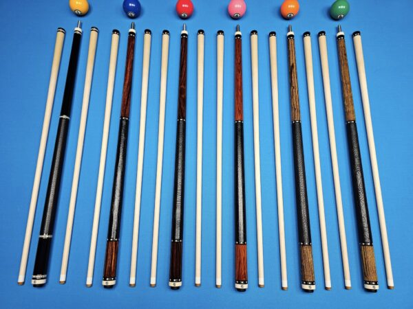 Choose Cue | #1: Carmeli All Ebony w/ 24 Dot Abalone Shell Rings, #2: Carmeli Dark Mexican Cocobolo w/ White Tiffany Diamonds – Embossed Liz Wrap, #3: Carmeli Dark Mexican Cocobolo w/ White Tiffany Diamonds – Spanish Bull Wrap, #4: Carmeli Fire Mexican Cocobolo w/ White Tiffany Diamonds, #5: Carmeli Bacote w/ White Tiffany Diamonds – Scotch Wrap, #6: Carmeli Bacote w/ White Tiffany Diamonds – Spanish Bull Wrap |