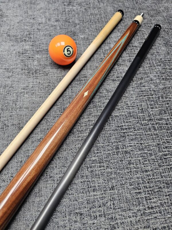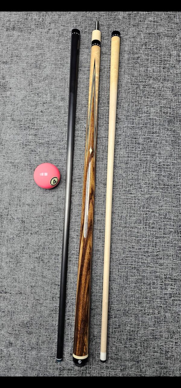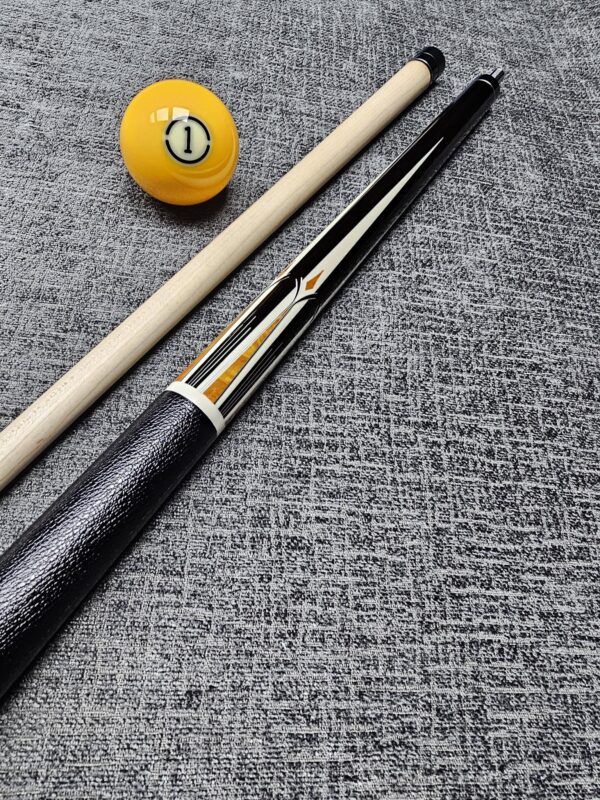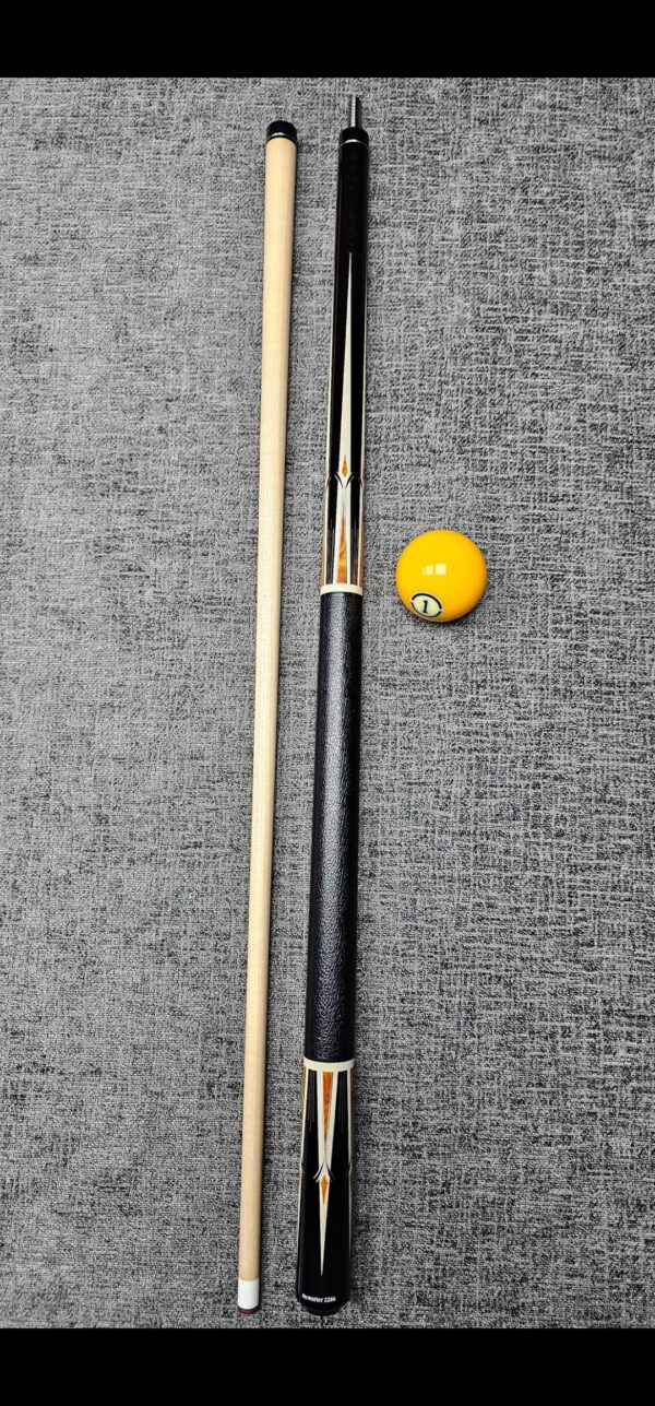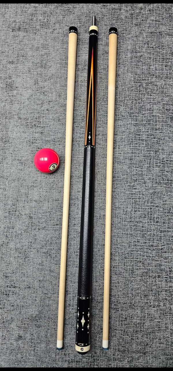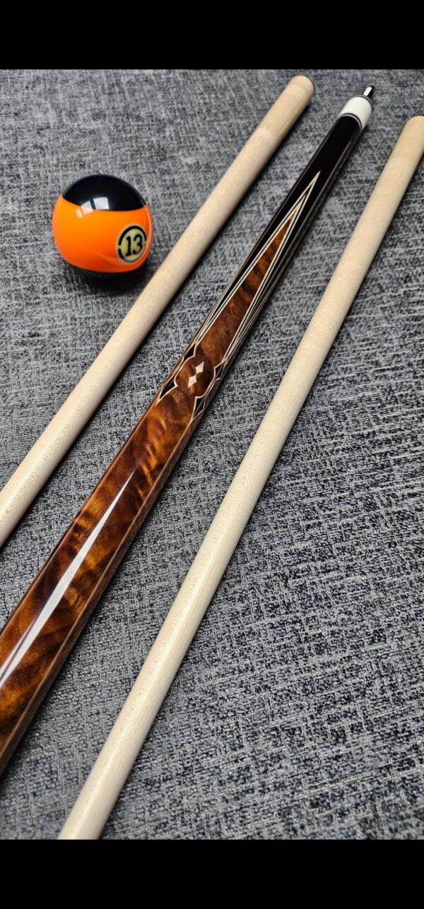 # 13- PFD STUDIOS Built off a rare John Davis full splice blank! Absolutely stunning Walnut “Slick Handle” & sharp points up & down! Natural & Black veneers- Gabon Ebony front & back! Very cool Arrowhead inlays throughout made from Ebony & Maple! Butt weight- 15.2 oz- Radial Pin- Two Maple shafts- 3.4 oz- 12.8 m. New Cue! – Only $ 3,175!