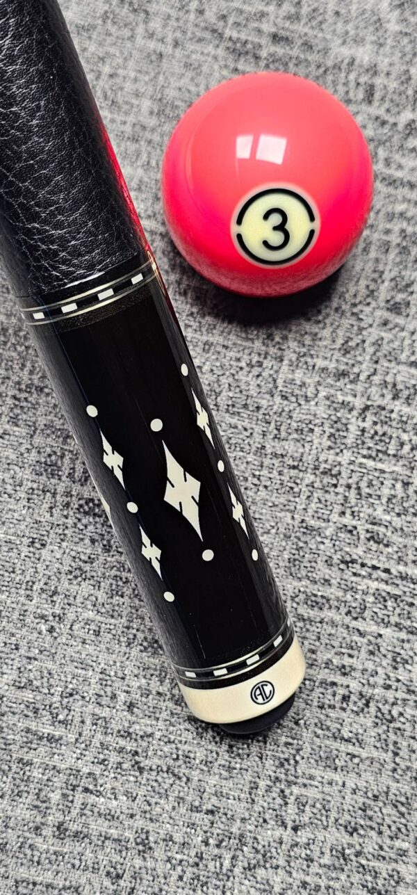 # 3- New Ariel Carmeli 4- Point Ebony in-to Ebony! Flame Veneers! White Diamonds & dot inlays & silver trim rings! Leather wrap- Prepped for an extension- Butt weight- 15.7 oz- Maple shafts- 3.5 oz- 13 m. 3/8-10 Pin – Only $ 4,250!