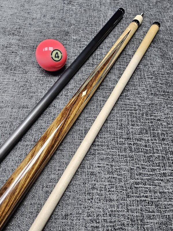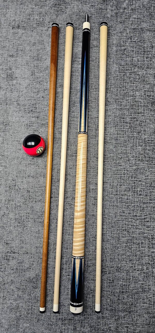 # 11- New Jim Pierce! Rare wrapless 12 point design! Gabon Ebony front & back! Curly Maple sharp points up & down! Double Blue & Black Veneers! Curly Maple “Slick Handle” w/ Crazy good figure! Black & White dash rings trimmed silver! ( 59″ Cue ) Even Split- Butt weight- 15 oz- Two Maple shafts- 3.5 oz- 12.75 m. Plus+ a JP “Killwood!” 3.7 oz- 12.75 m. 3/8-10 Modified Pin – Only $ 3,475!
