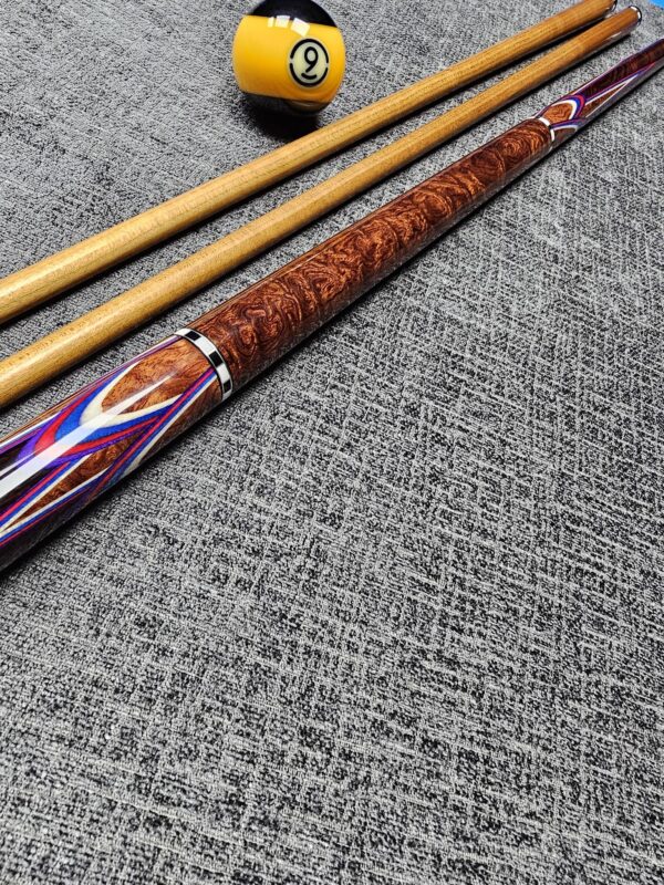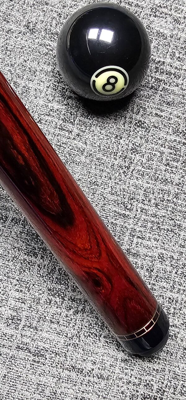 # 8- New Diveney full splice! Fire Mexican Cocobolo! Very sharp “Bridged Points!” w/ Beautiful Blu e/ Red / Orange / Yellow Veneers! Copper RR track rings! Butt weight- 15 oz- 3/8-10 Modified Pin- Two dark roasted Tras K Kielwood shafts! 3.3 oz- 12.7 m. / 3.5 oz- 12.75 m. – Only $ 2,750!