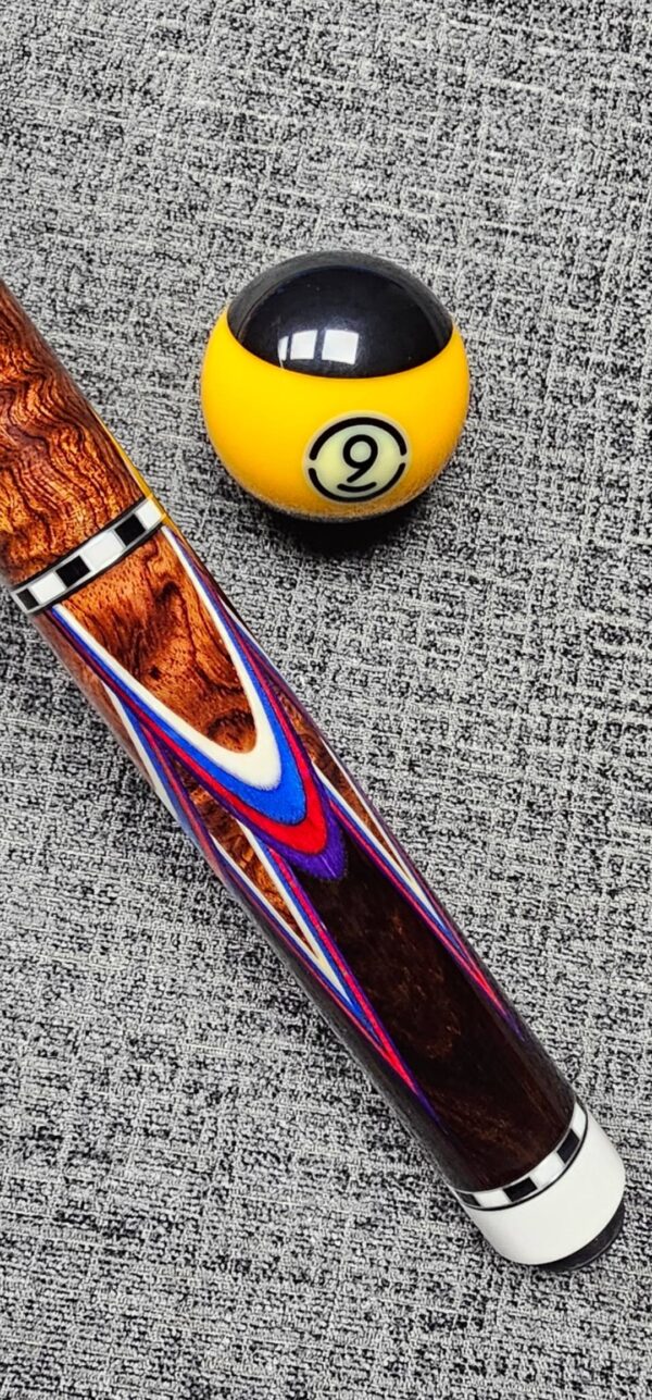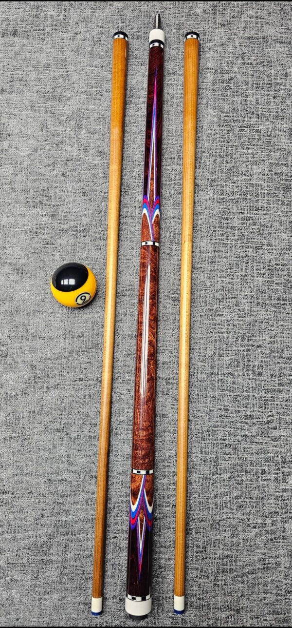SOLD! # 9- Big Diveney wrapless Butterfly with premium wood! Crazy good Water-fall Bubinga & Cocobolo! Very sharp points up & down! Red / White / & Blue veneers & Butterflies! Black & White Checkered Ring work w/ silver trim at all positions! Butt weight- 15.8 oz- 3/8-10 Modified Pin- Two med roasted Tras K Kielwood shafts! 3.4 oz- 12.7 m. / 3.3 oz- 12.75 m. New Cue!