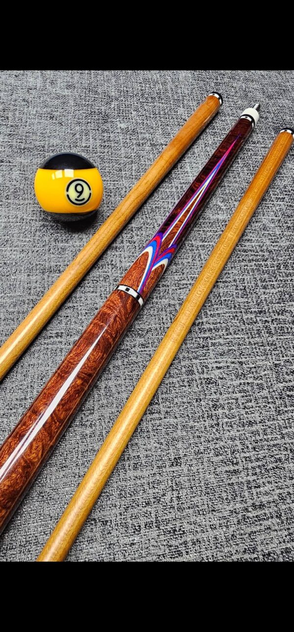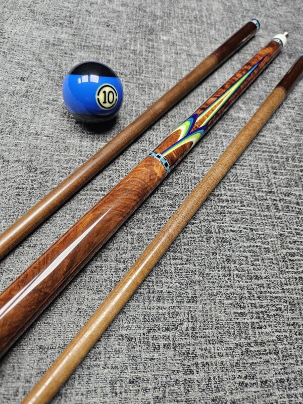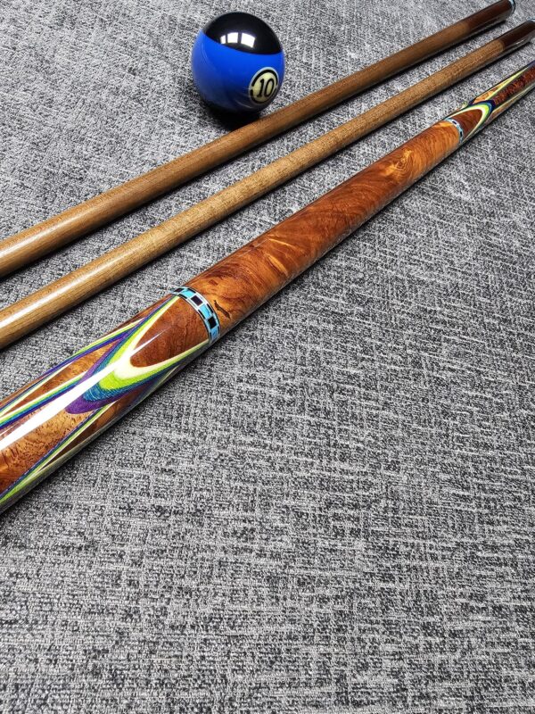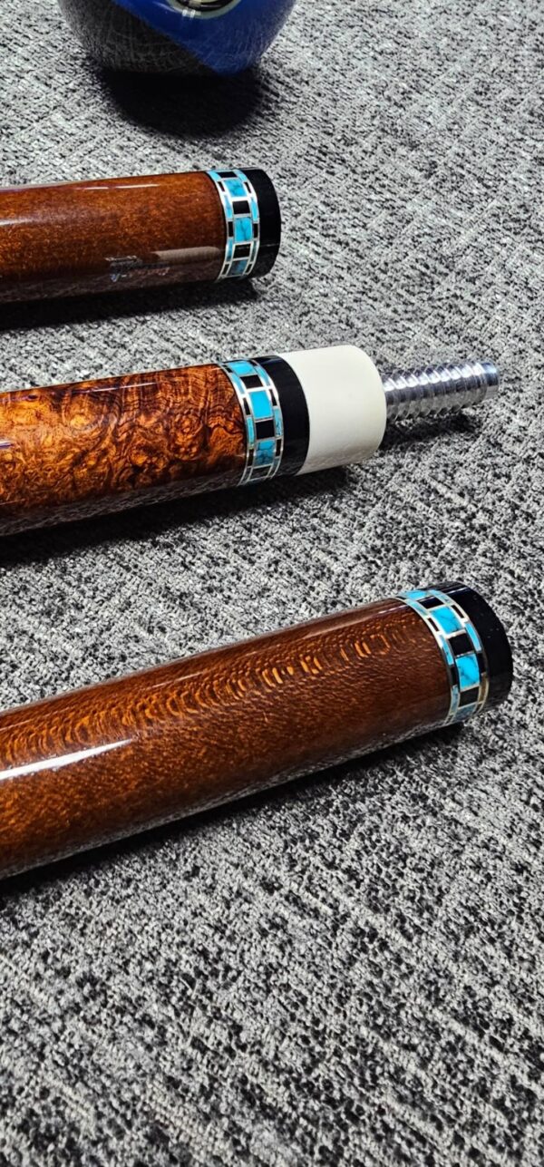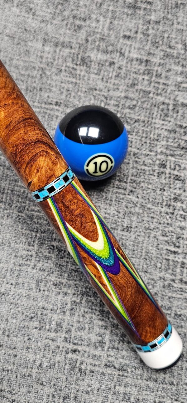 SOLD! # 10- Big Diveney wrapless Butterfly with premium wood! Absolutely stunning, top shelf, & rare Honduran Rosewood Burl!!! ( Very hard to source ) Especially this caliber! Very sharp points up & down w/ Purple / Blue / Lime / Natural Veneers & Butterflies! ( HUGE UPGRADE in wood & Special Rings! ) Triple Stacked Turquoise & Ebony rings bordered in silver at all positions! Butt weight- 15.7 oz- 3/ 8-10 Modified Pin- Two Tras K Kielwood shafts! Dark Roasted- 3.4 oz- 12.75 m. / 12.8 m. Prepped for an extension- New Cue!