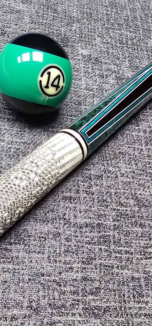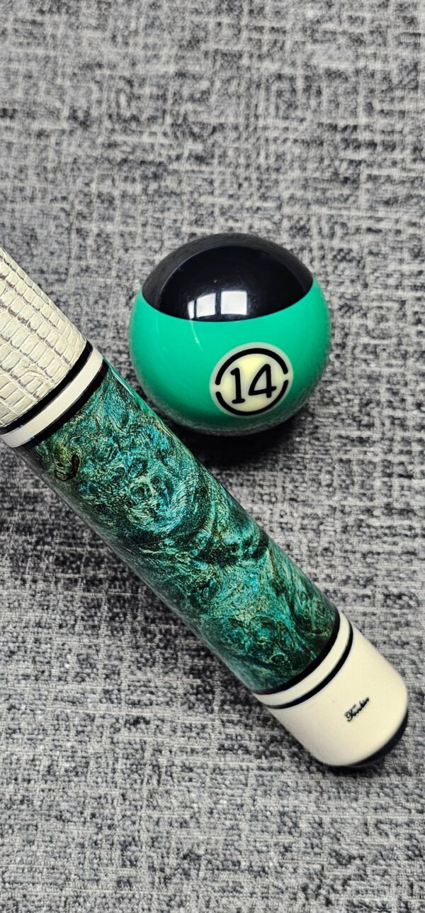 # 14- New Pete Tonkin! 4- Very sharp points of wild & crazy green Stabilized Maple Burl! Gabon Ebony front & Green Burl butt sleeve- Bridged Points w/ Six veneers! White / Black / Green / Green / Black/ White! The wood is out of this world cool in person! Premium Ring tailed Liz wrap! 3/8-10 Modified big pin w/ SS Joint! Talk about a solid hitting cue! White rings w/ silver trim at all positions- Butt weight- 14.9 oz- Two Maple shafts- 4.1 oz- 12.9 m. – Only $ 4,475!