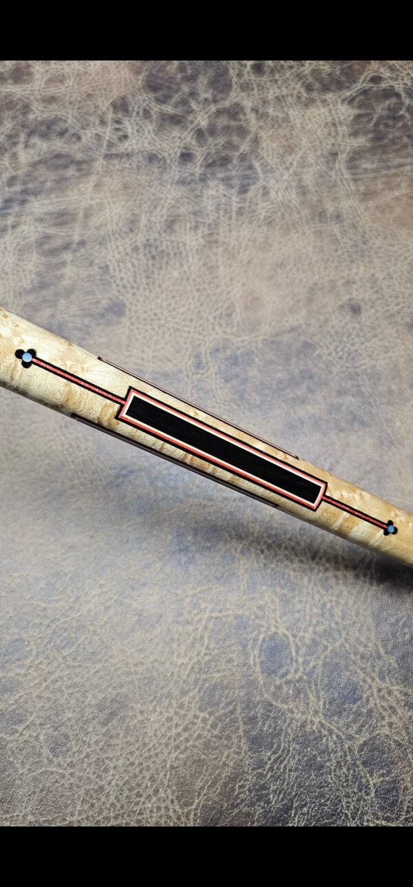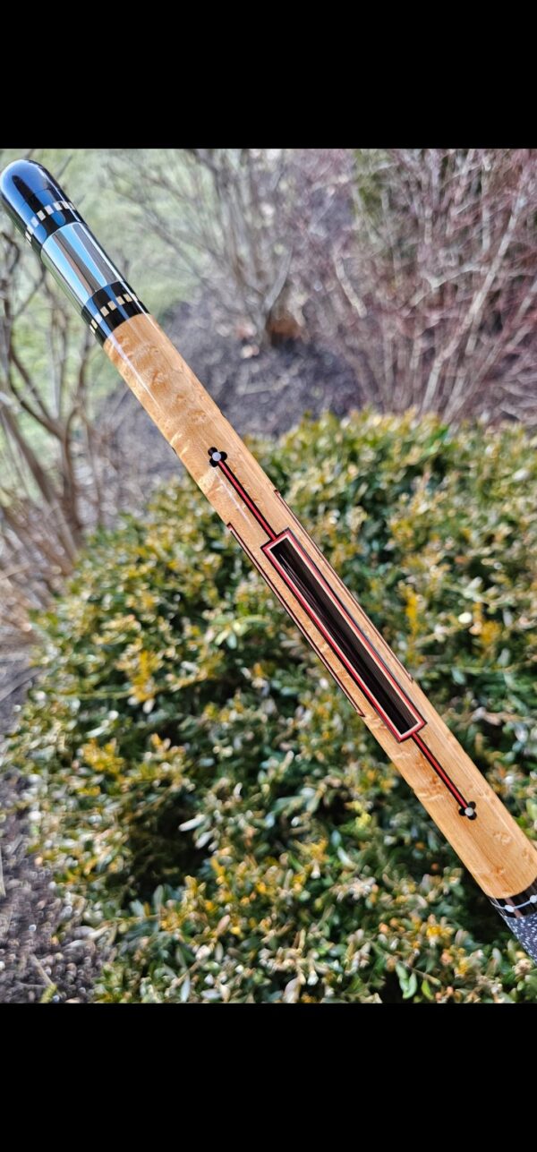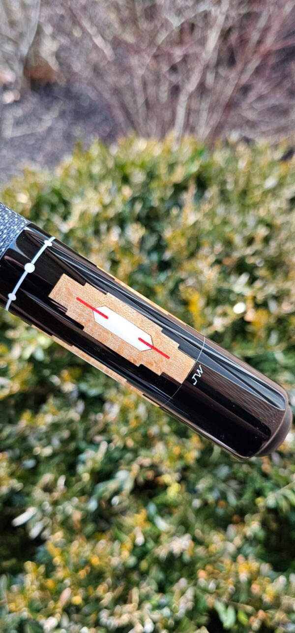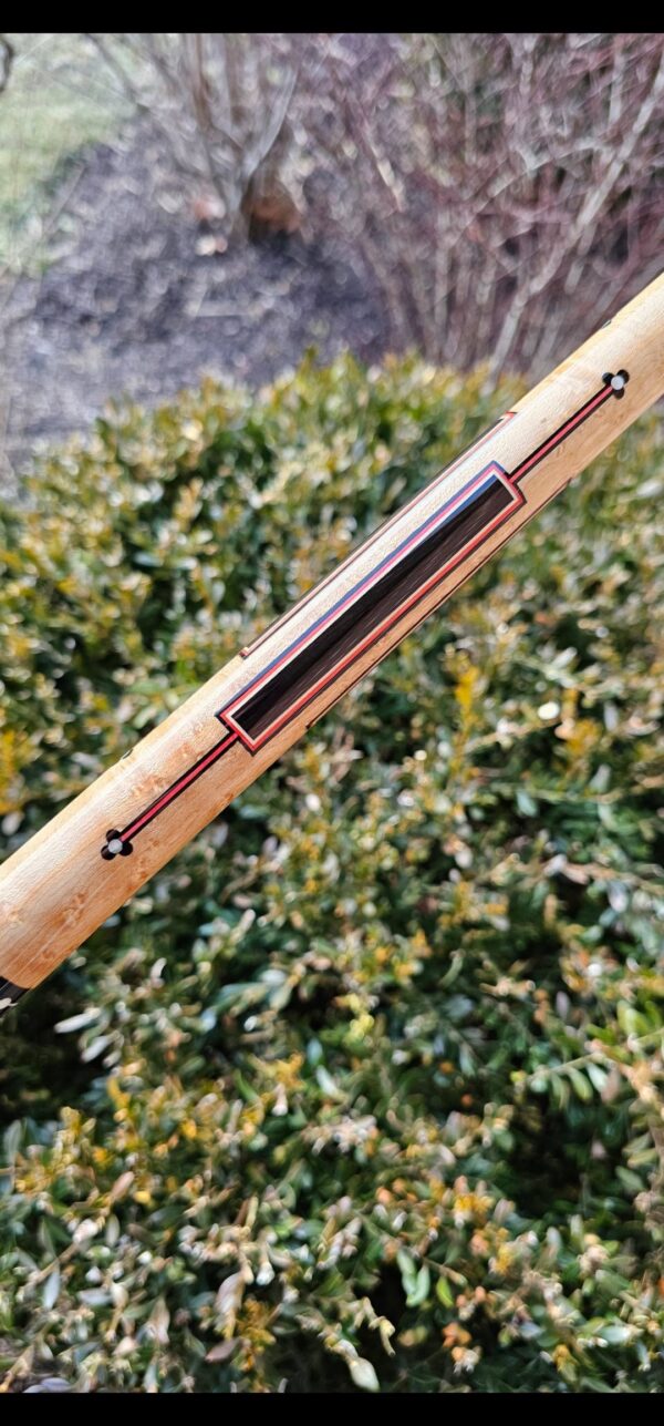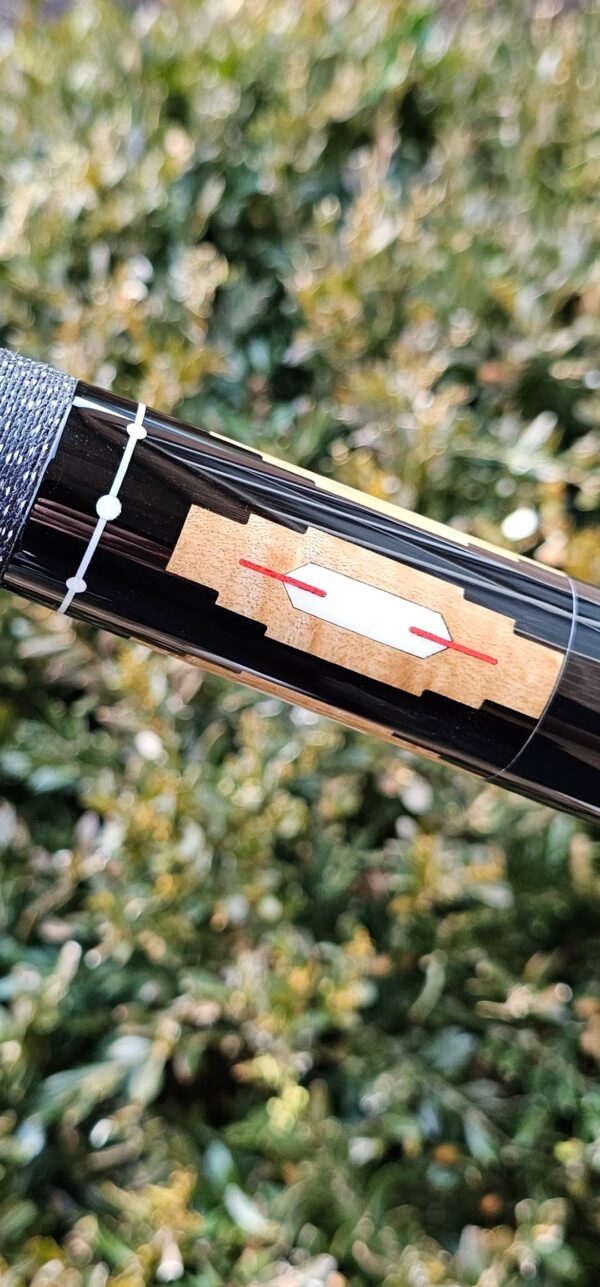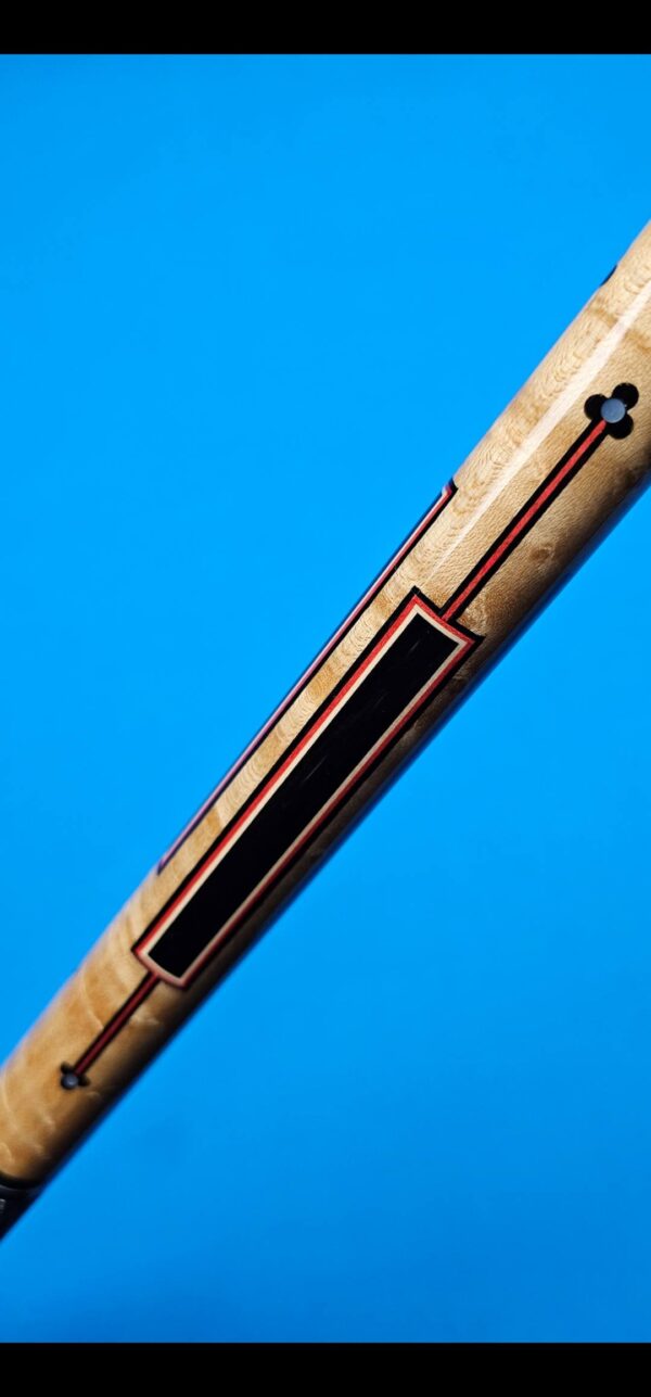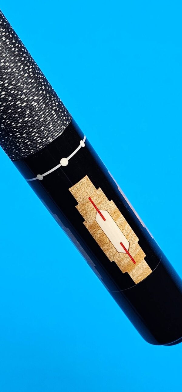 - The large maple inlaid window in the butt sleeve is patterned after a very traditional native-American shape. Inside, he uses one of his favorite early patterns – a rectangle with pointed ends (of ivory) with a red veneer coming out of each end. Stroud, Tad and Gutierrez (Ginacue) all used this basic shape frequently.