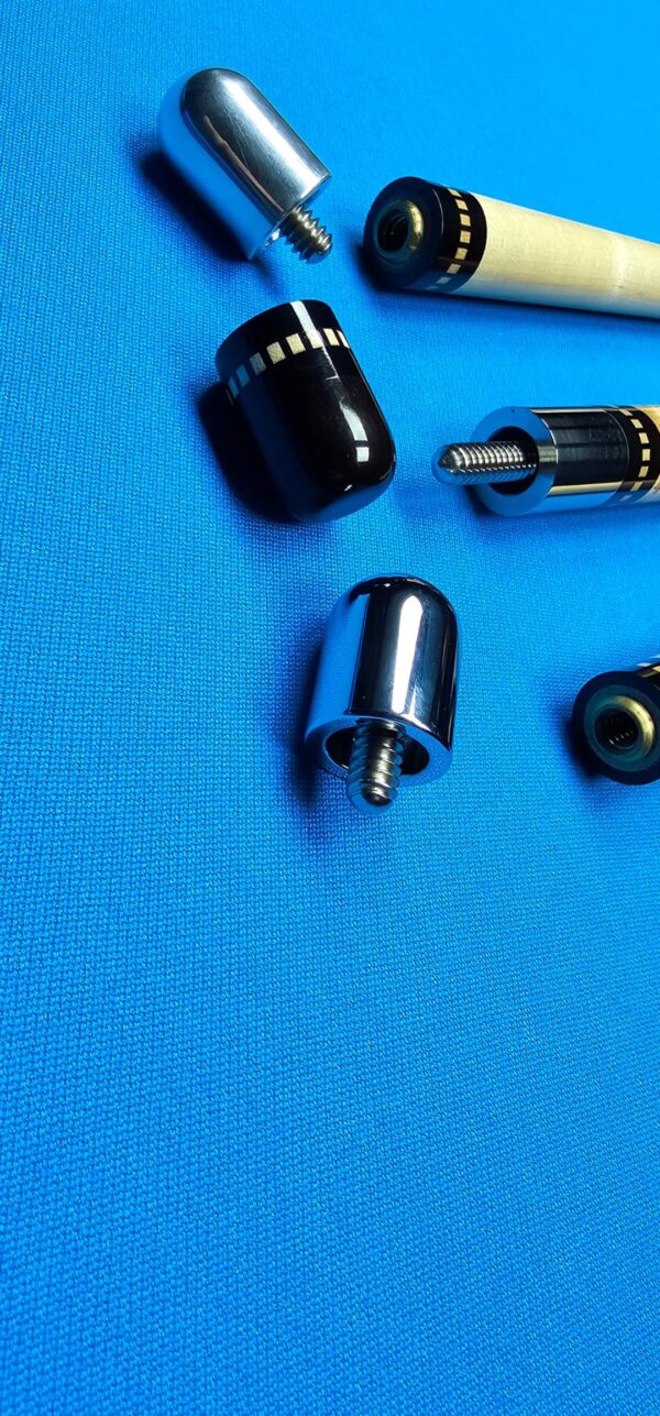- It comes with original old joint protectors. The butt cap has a matching ring, and the shafts have the classic turned, polished stainless steel caps that he used at the time for his “upper end” cues.