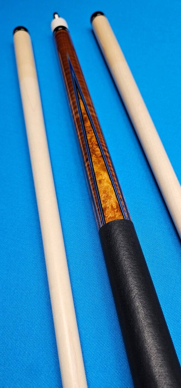 - Very well constructed cue like everything Leon Sly builds of course! This one is cored up top with Purple Heart and it has a laminated Maple handle.This type of construction not only has a great hit and awesome overall playability, it’s made to stand the test of time…….. Very stable, durable, and well balanced.