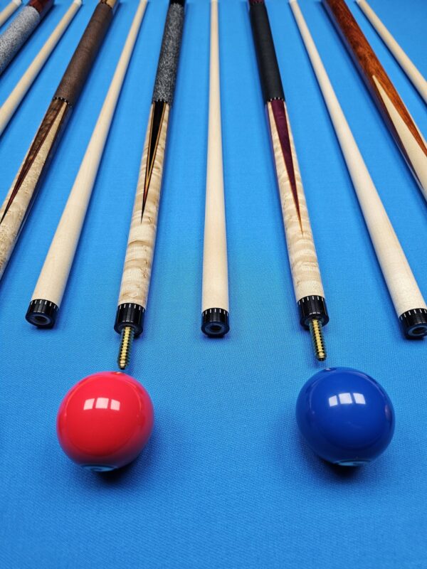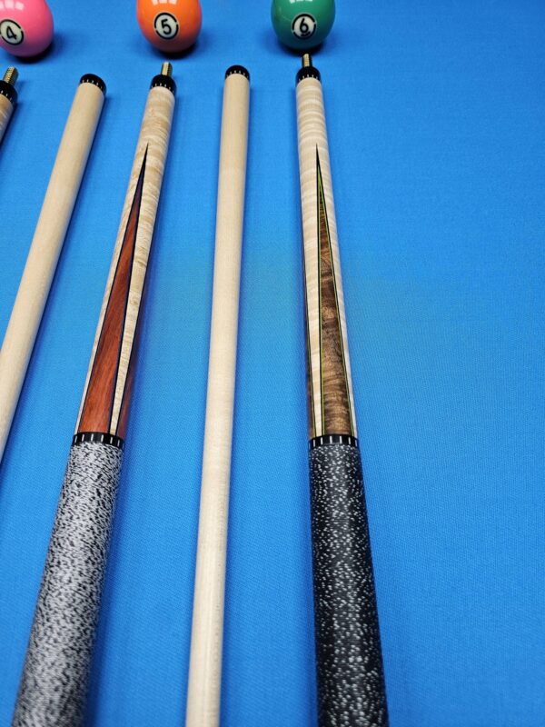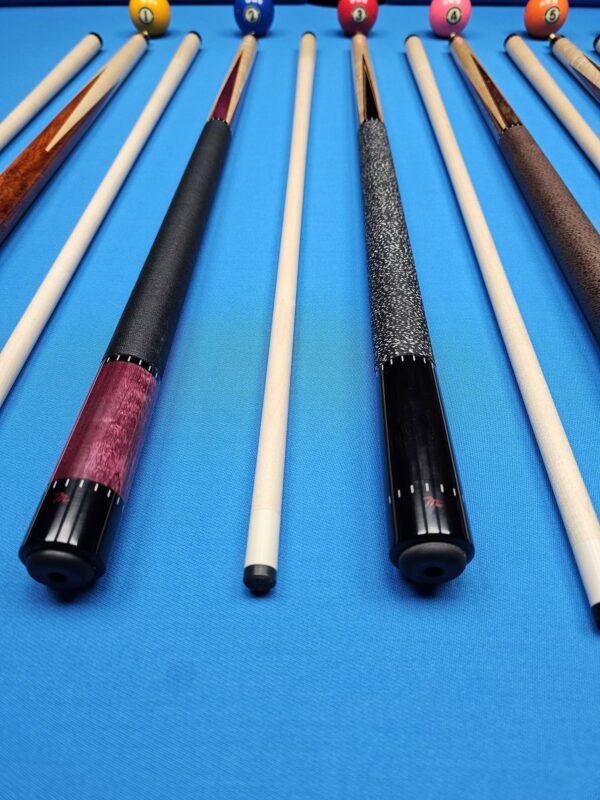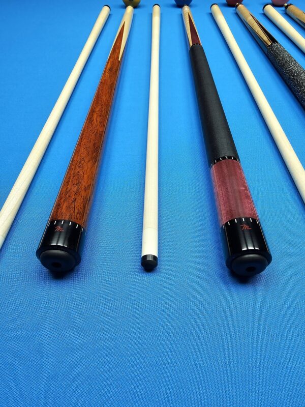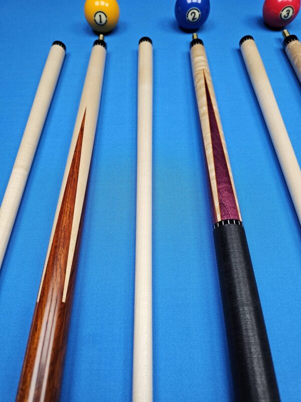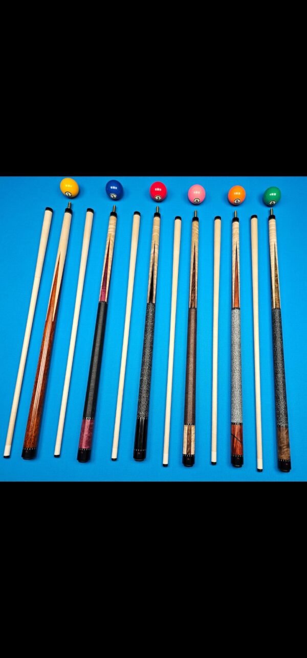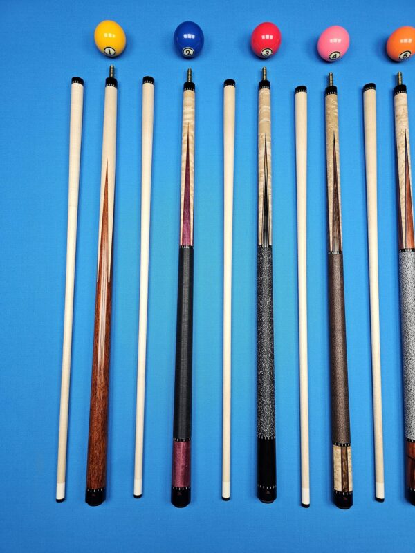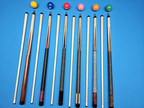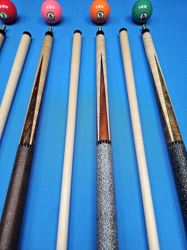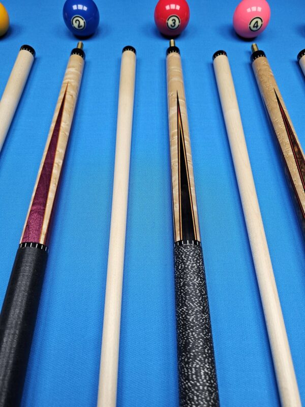 | Choose Cue | # 1- McFadden Full Splice Sneaky Pete Style, # 2- McFadden Purple Heart & Birdseye Maple 4- Point, # 3- McFadden Ebony & Birdseye Maple 4- Point, # 4- McFadden Walnut Burl & Birdseye Maple 4 Point, # 5- McFadden Red Heart & Birdseye Maple 4- Point, # 6- McFadden 60" Walnut Burl & Curly Maple 4 |