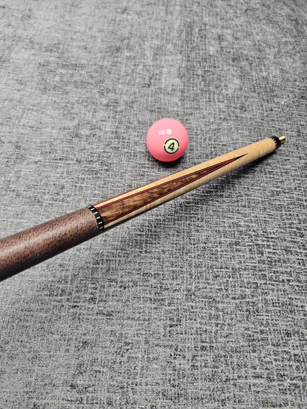 # 4- Walnut Burl & Birdseye Maple 4 Point– Black & Red Veneers- Brown & Black Linen wrap- Butt weight- 15.1 oz- 3/8-10 Pin- Maple shaft- 4.1 oz- 13 m. 58″ Extra design work in butt – Only $1,575!