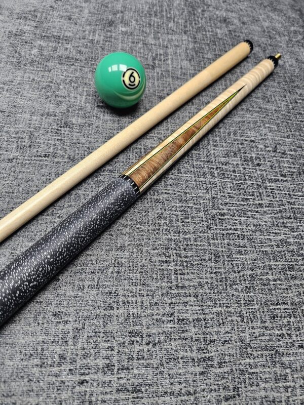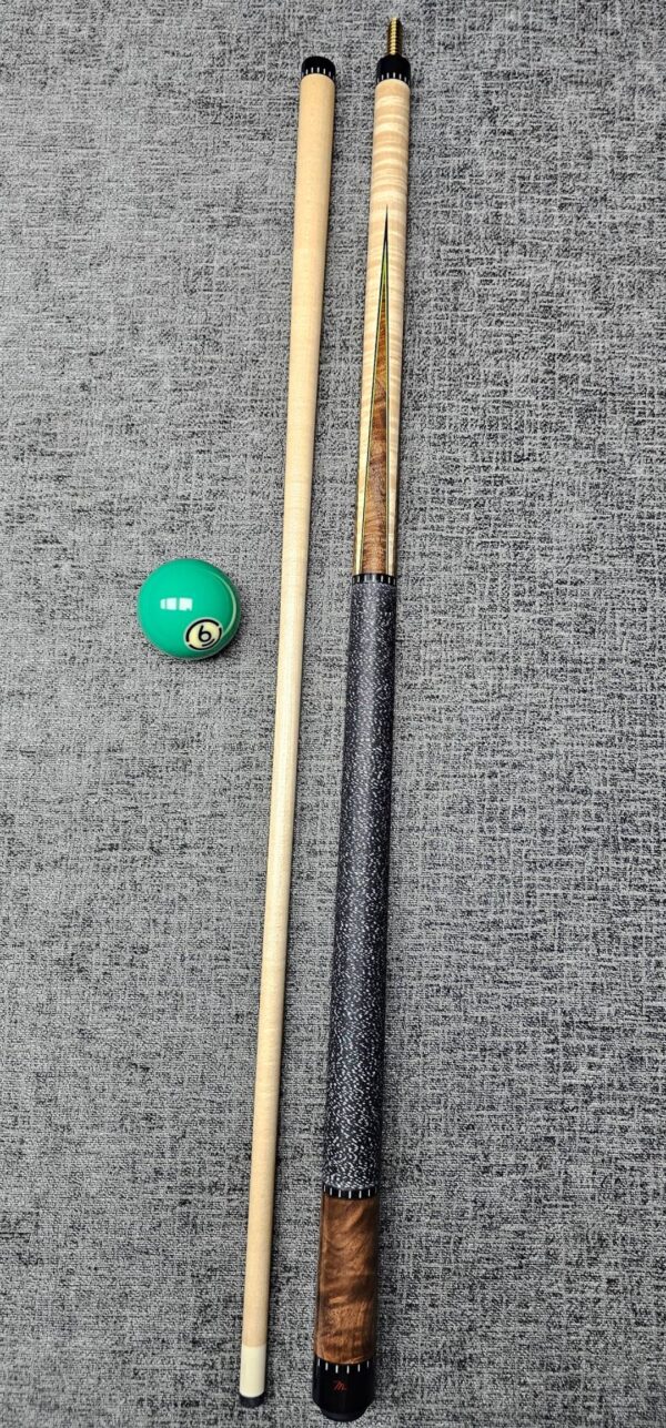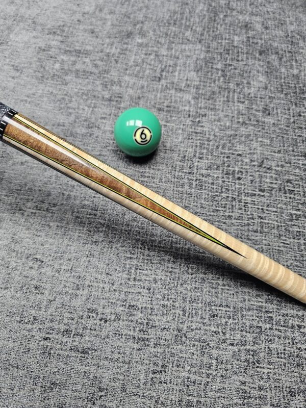 # 6- ( 60″ Cue. ) Walnut Burl & Curly Maple 4- Point– Green & Black Veneers- Black & White Linen- Butt weight- 15.2 oz- 3/8-10 Pin- Maple shaft- 4.1 oz- 13 m. – Only $ 1,575!