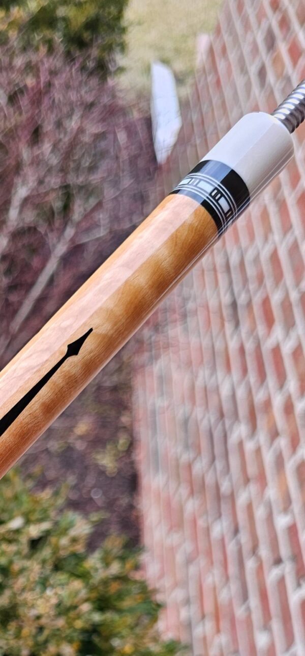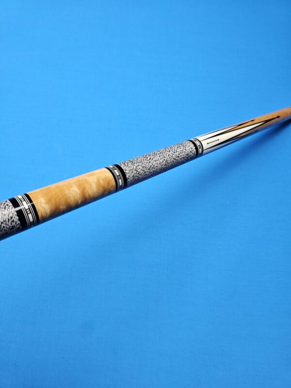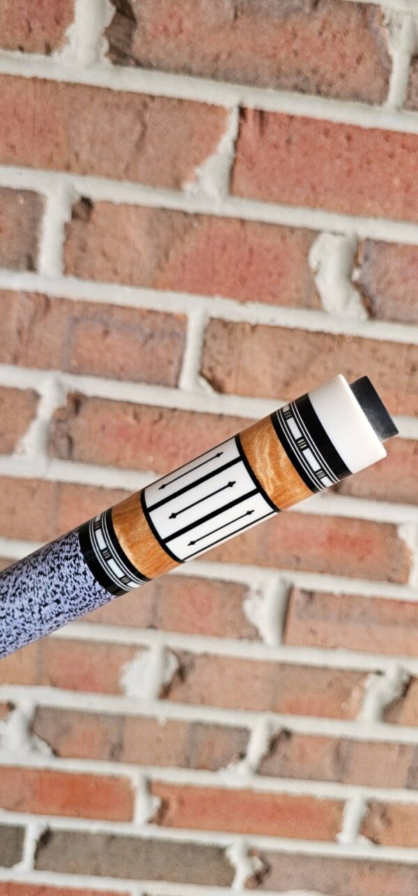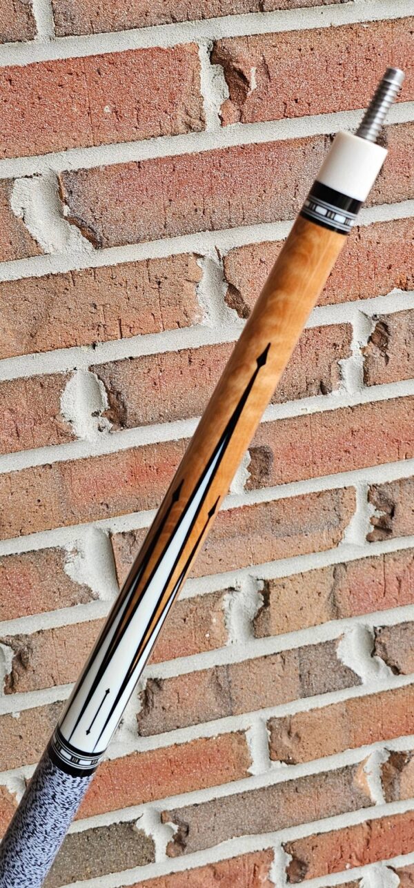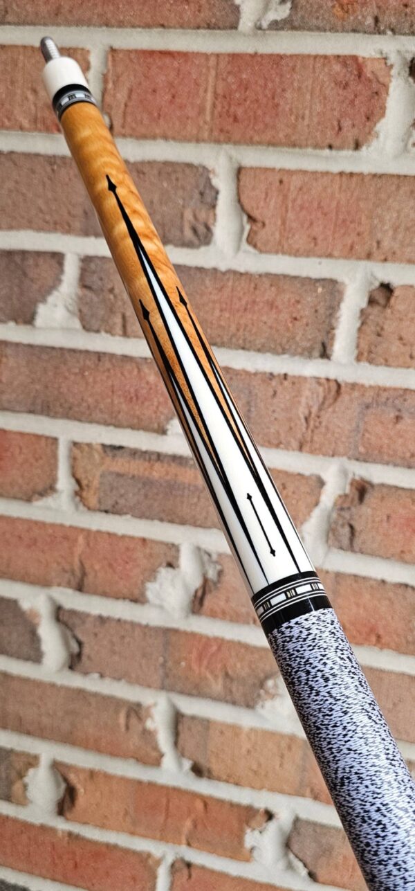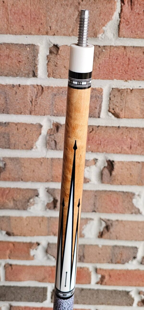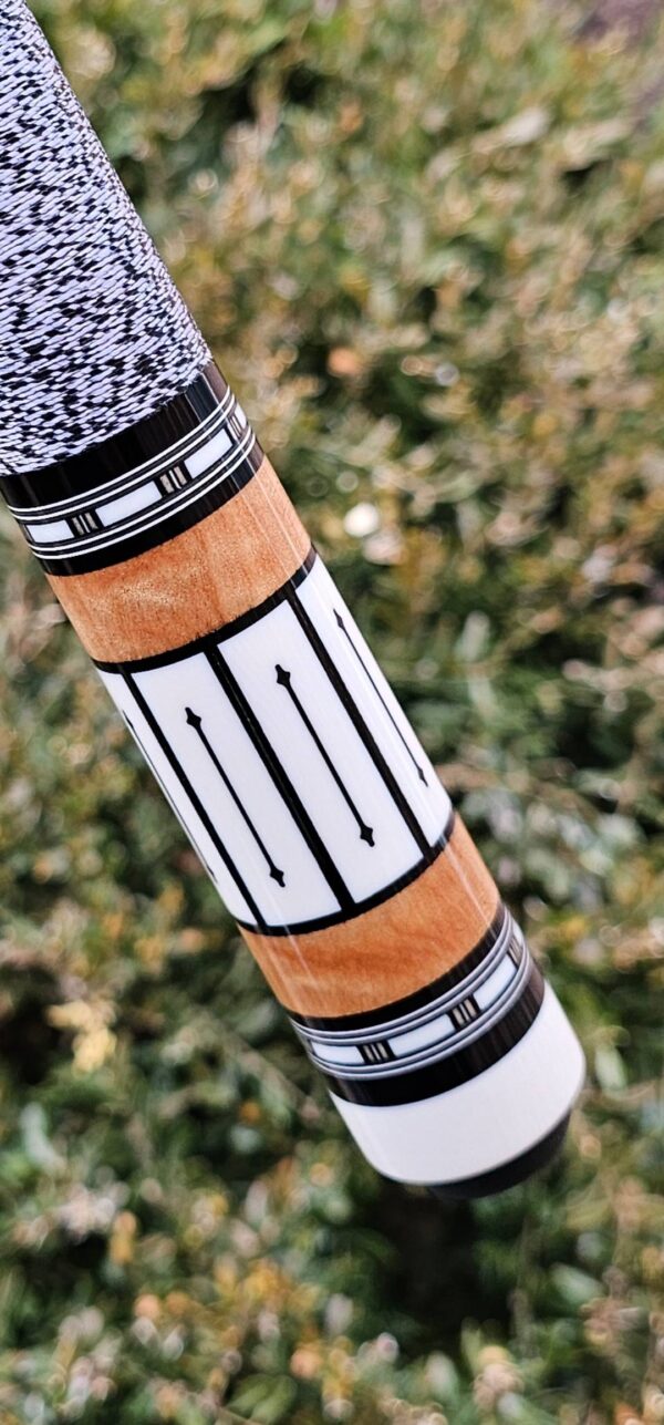 • The front and back of the cue is separated with a special segmented handle consisting of a mid section made from Quilted Maple & two sections of White & Black Linen! Each sharp point along w/ the 8 matching boxes are outlined in black to create a nice clean finishing touch all throughout the beautiful design!
