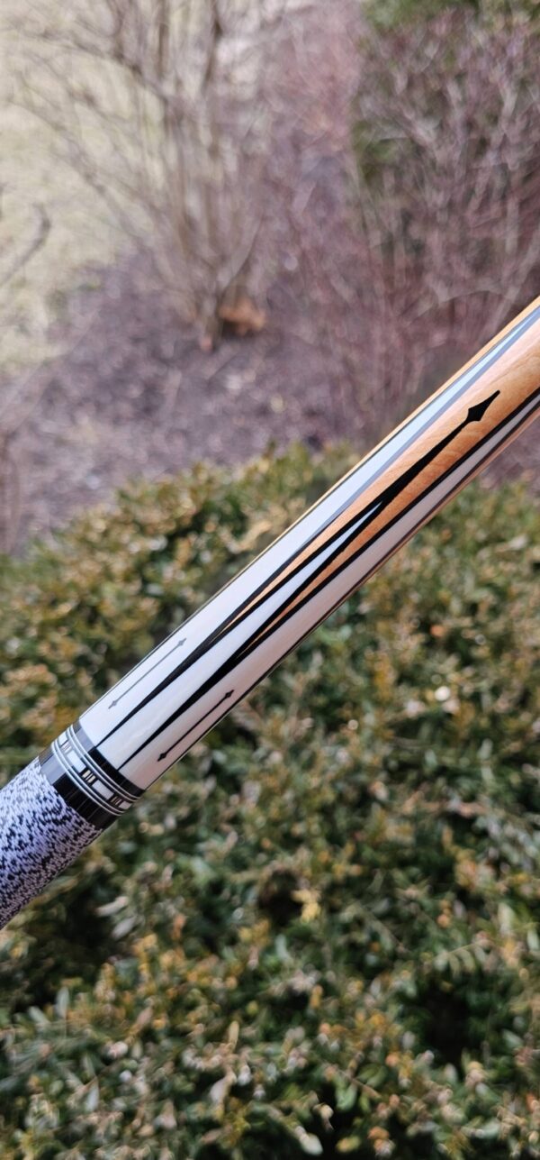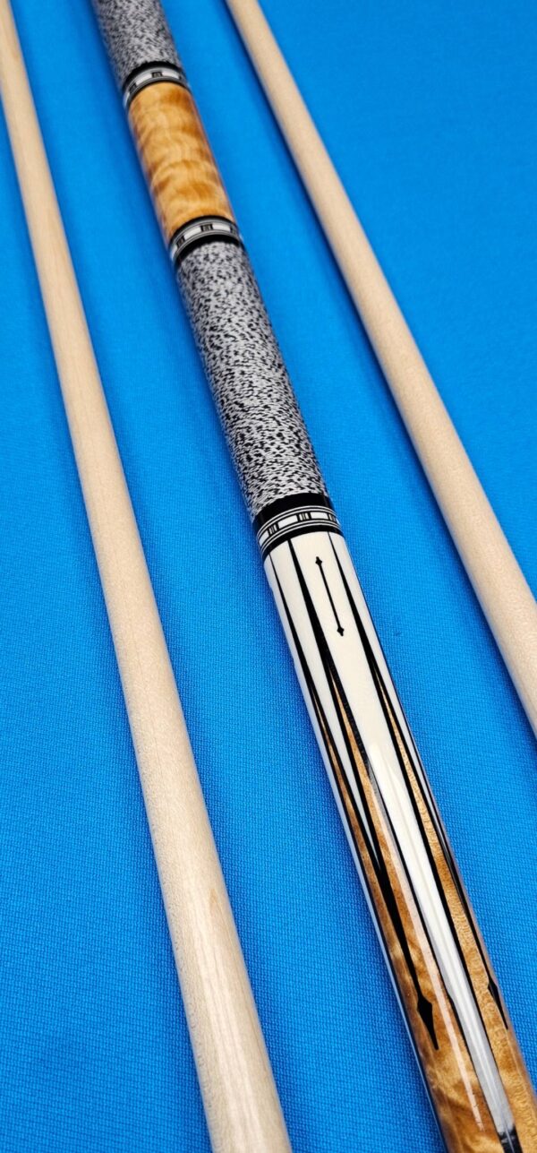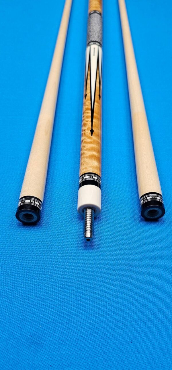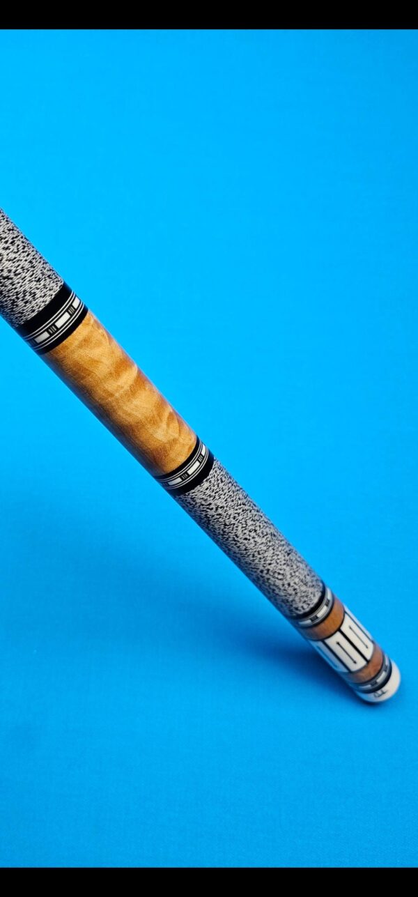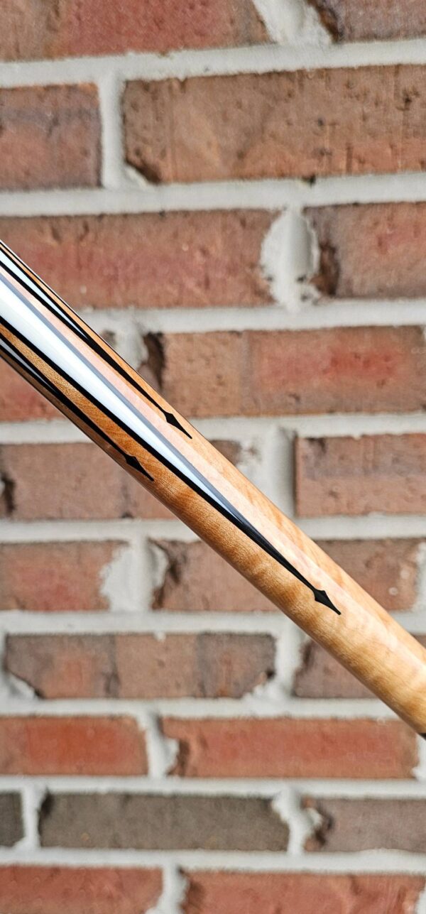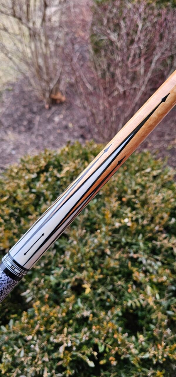 • The front and back of the cue is separated with a special segmented handle consisting of a mid section made from Quilted Maple & two sections of White & Black Linen! Each sharp point along w/ the 8 matching boxes are outlined in black to create a nice clean finishing touch all throughout the beautiful design!