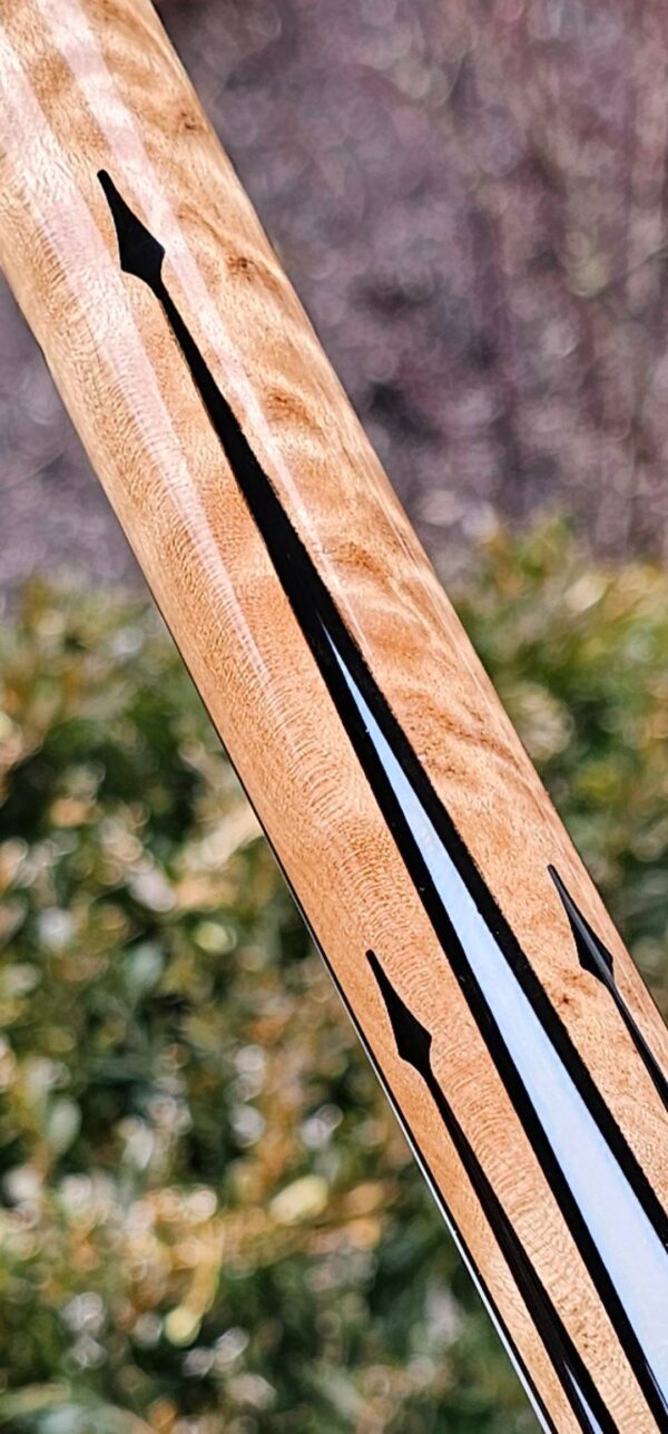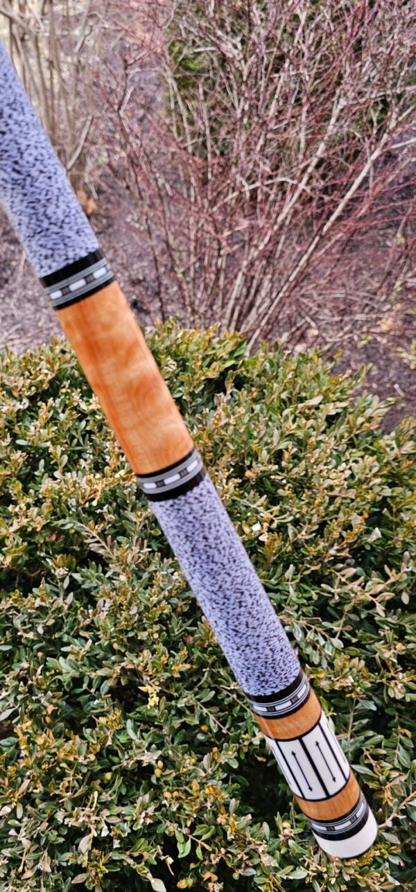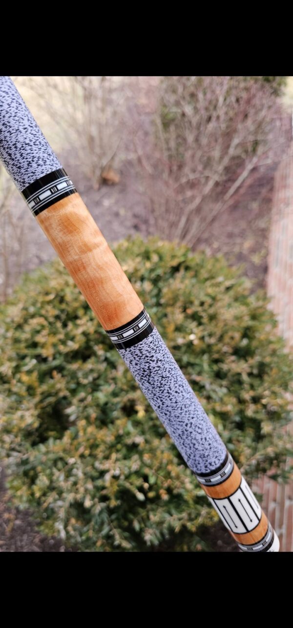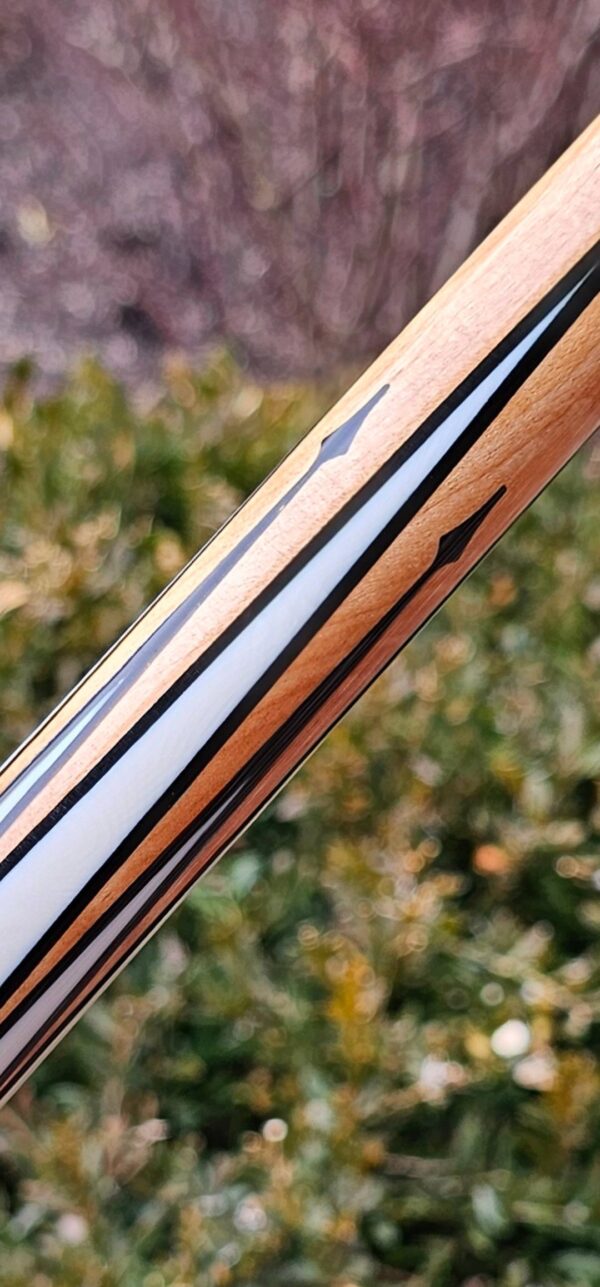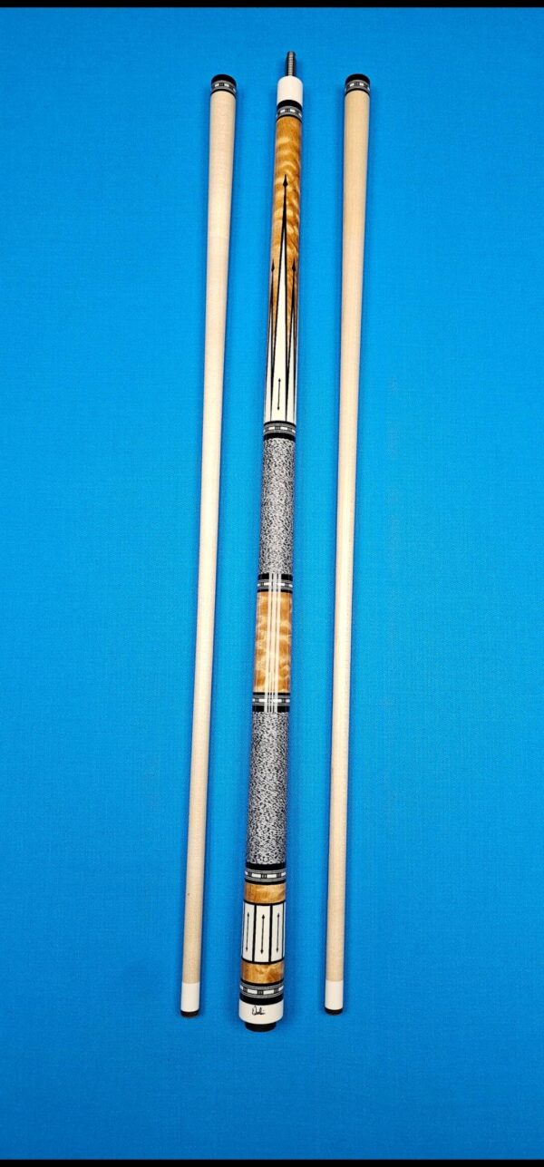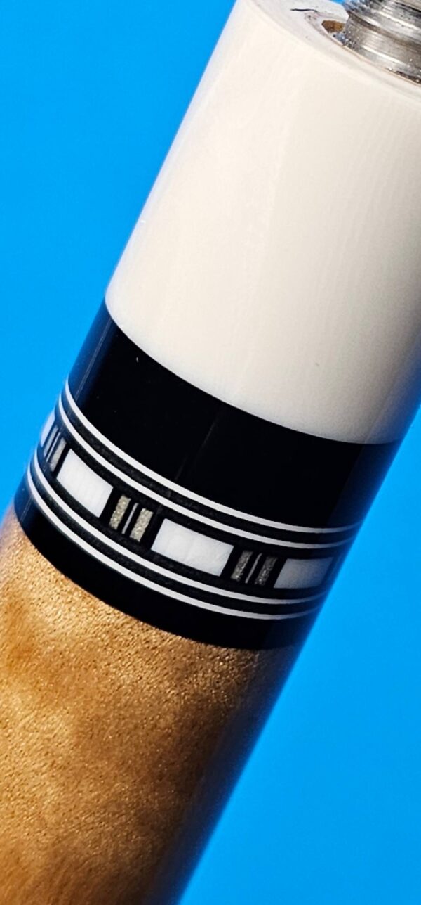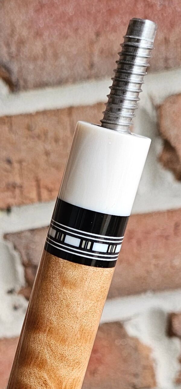 • The front and back of the cue is separated with a special segmented handle consisting of a mid section made from Quilted Maple & two sections of White & Black Linen! Each sharp point along w/ the 8 matching boxes are outlined in black to create a nice clean finishing touch all throughout the beautiful design!