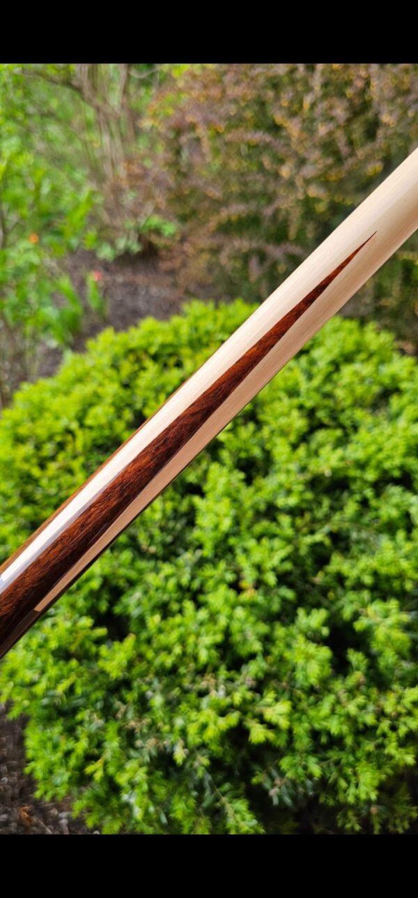 SOLD! # 2- 60″ Mike Capone! Cocobolo & Straight grain maple- Radial Pin- Butt weight- 15.1 oz- Maple shaft- 3.3 oz- 12.4 m. Very clean overall with a few tiny marks and dings near the butt cap that are extremely hard to notice or feel. Everything rolls straight together and apart!