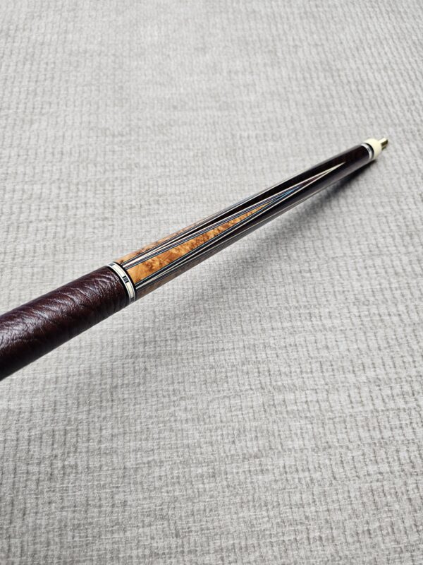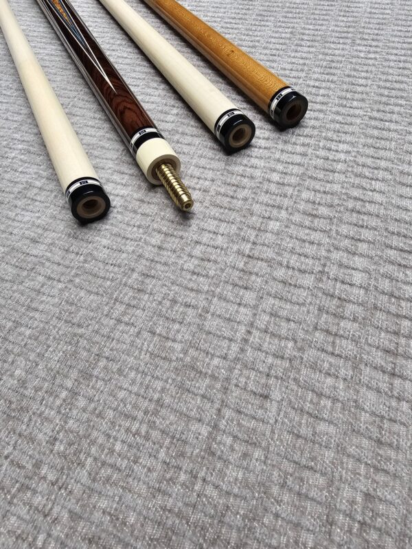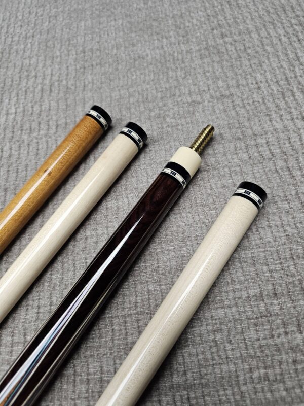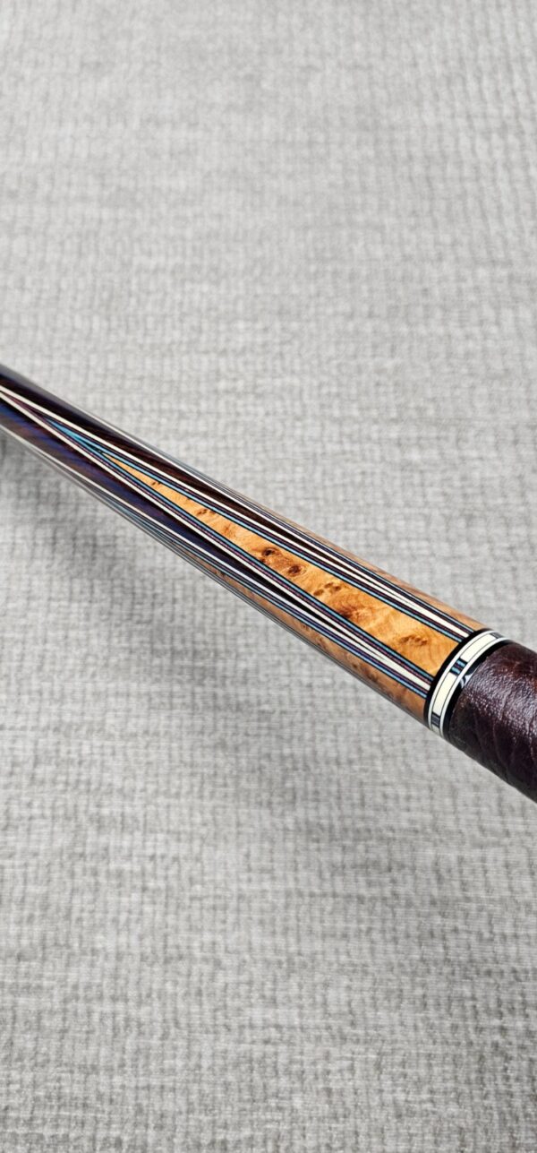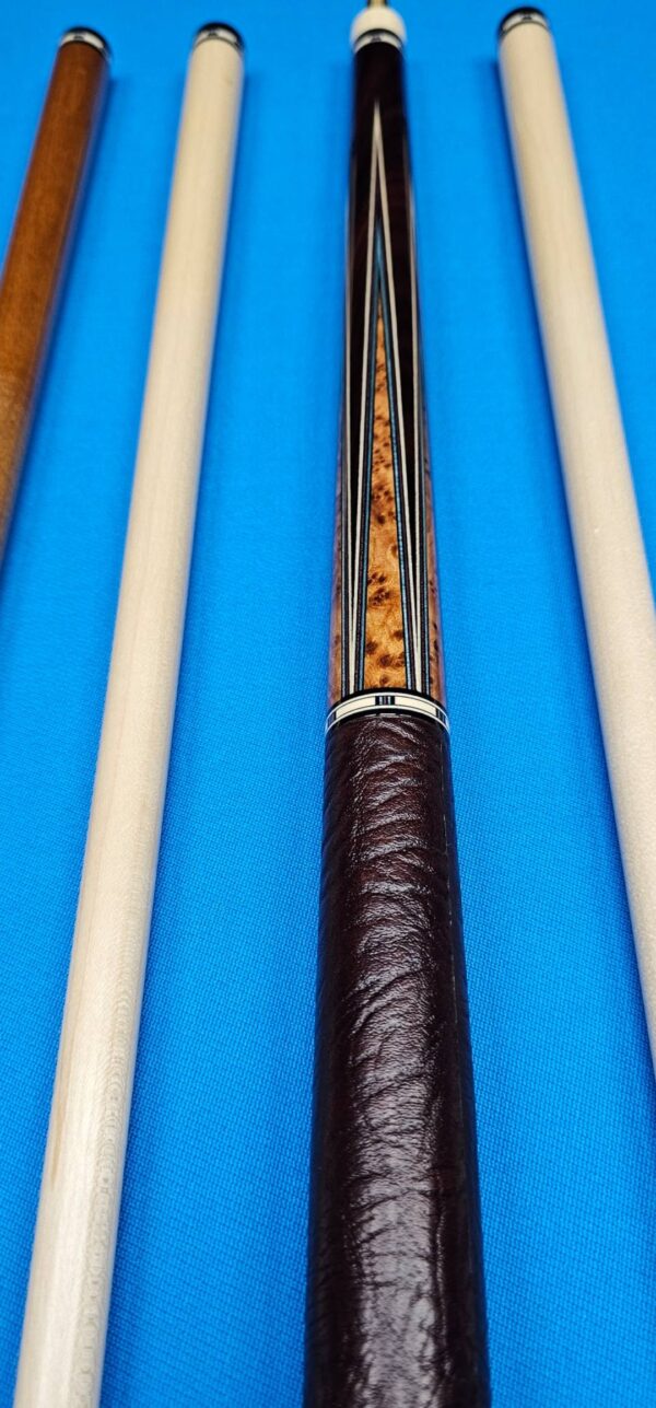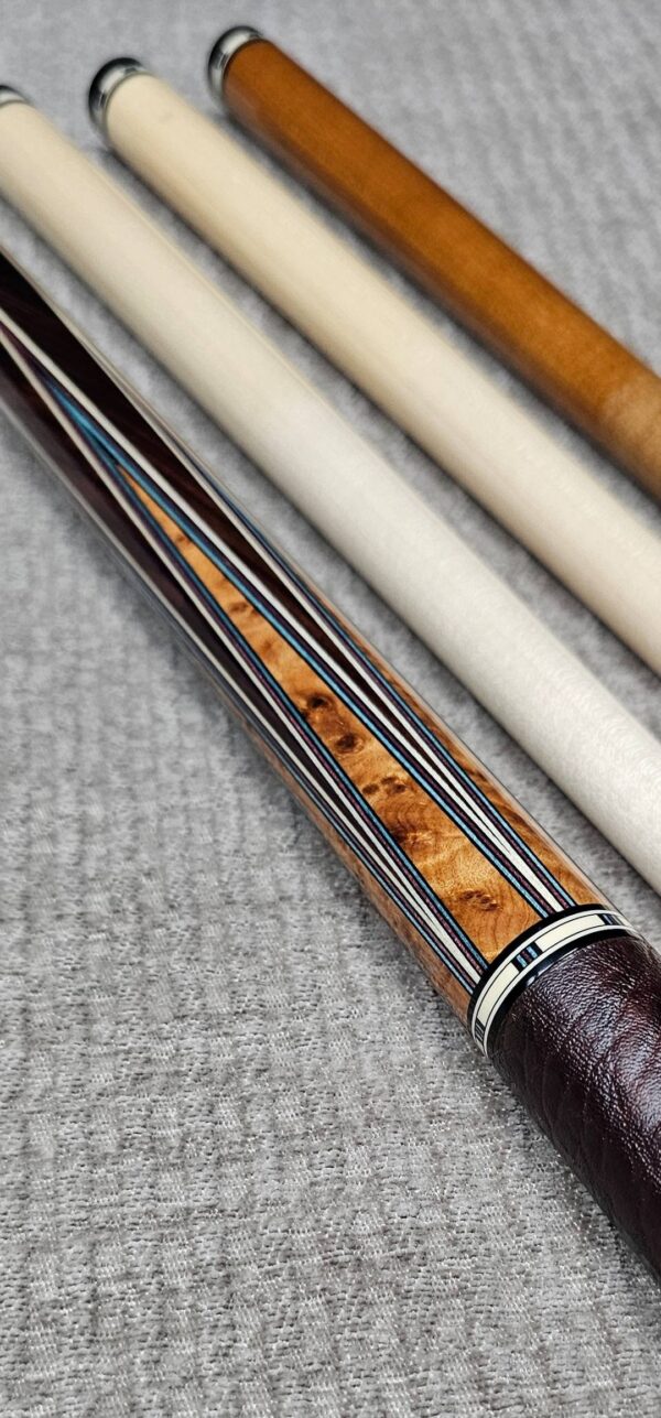Before we began this cuemaking journey, we were pool players, first and foremost. So, although we go to great lengths to create a cue that is pleasing to the eye, we fully intend for each of our cues to see action on the table. We design and construct our cues to perform at the highest level, as well as to provide solid, pleasant and predictable feedback on every shot. Our cues have a slight forward balance that feels very natural at the table. Our shafts have a modified Pro Taper and short ferrule combination developed over 2 years of testing to produce a classic medium-firm hit while retaining excellent deflection characteristics.