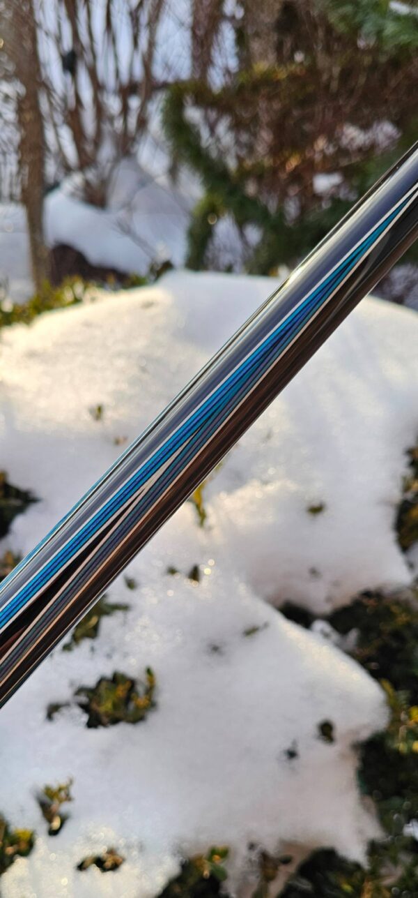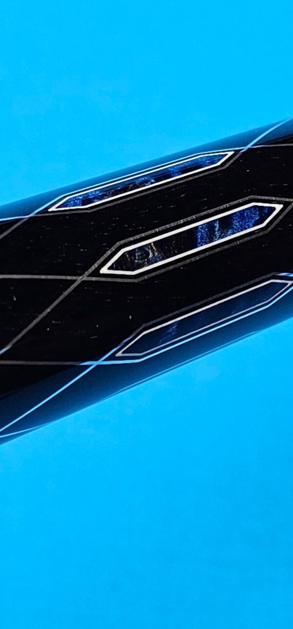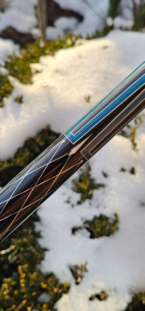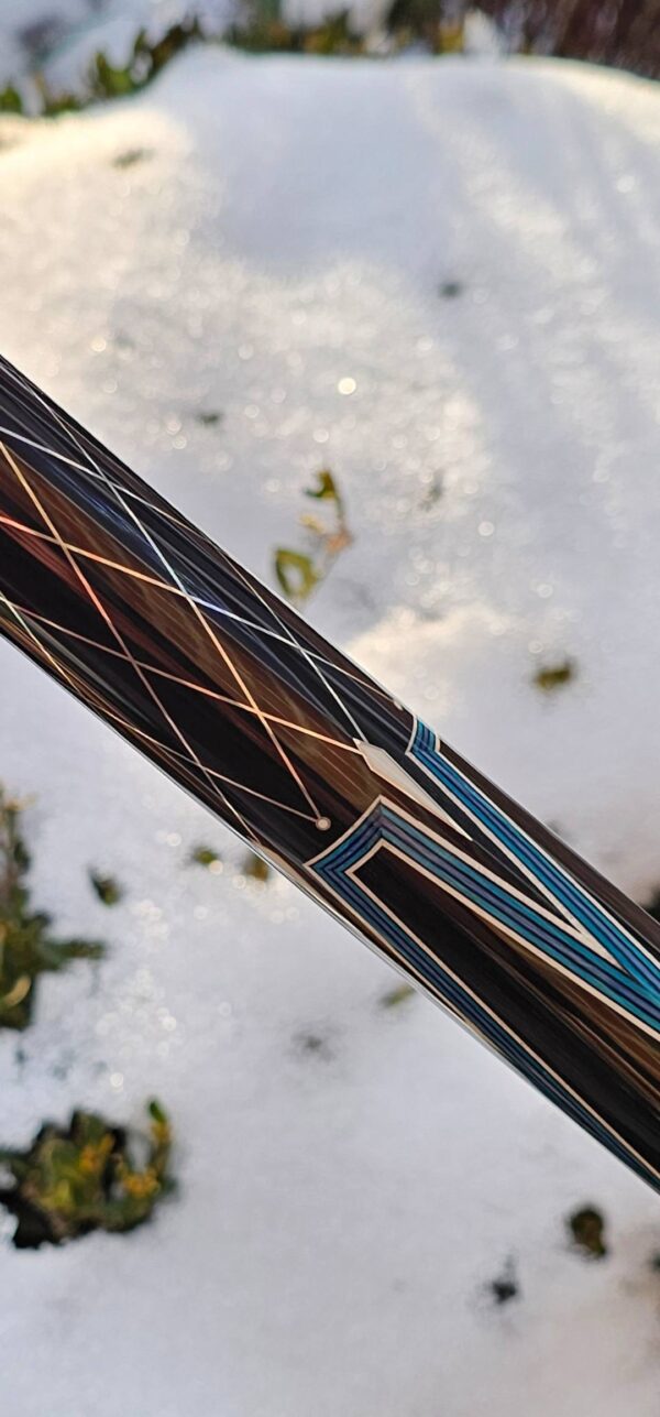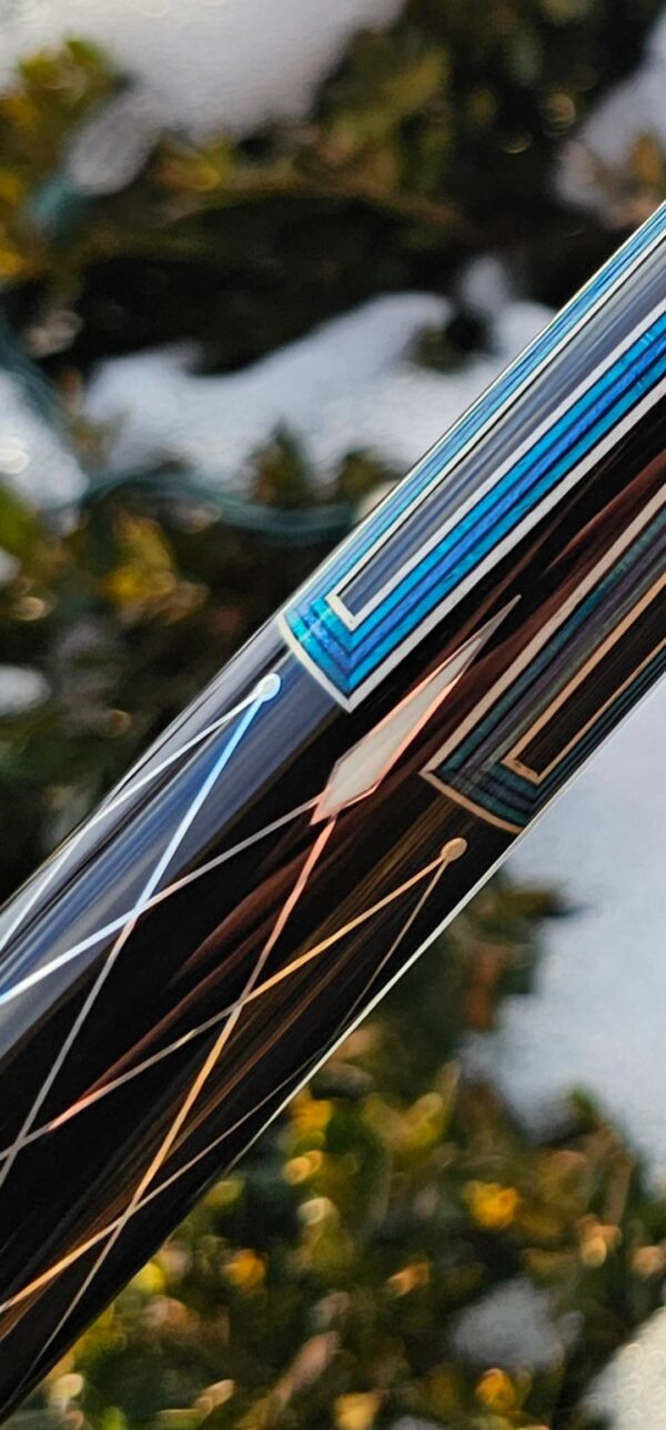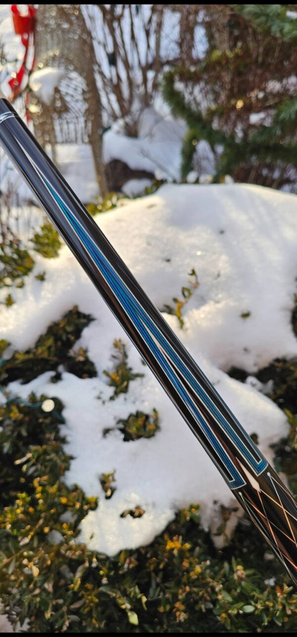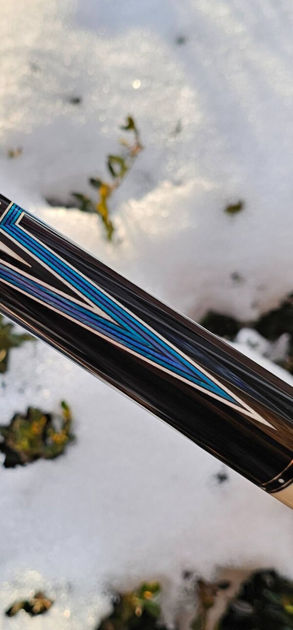 - Silver collar rings that add their own special & unique touch of beauty! Besides the ornate blue Burl panel’s their are also white arrows & dots incorporated within the outstanding design…….