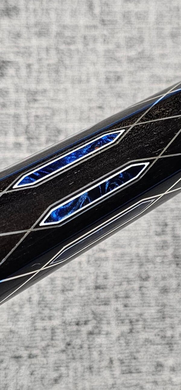 - The Ebony handle features extremely advanced & intricate silver work framing blue Burl panel inlays!