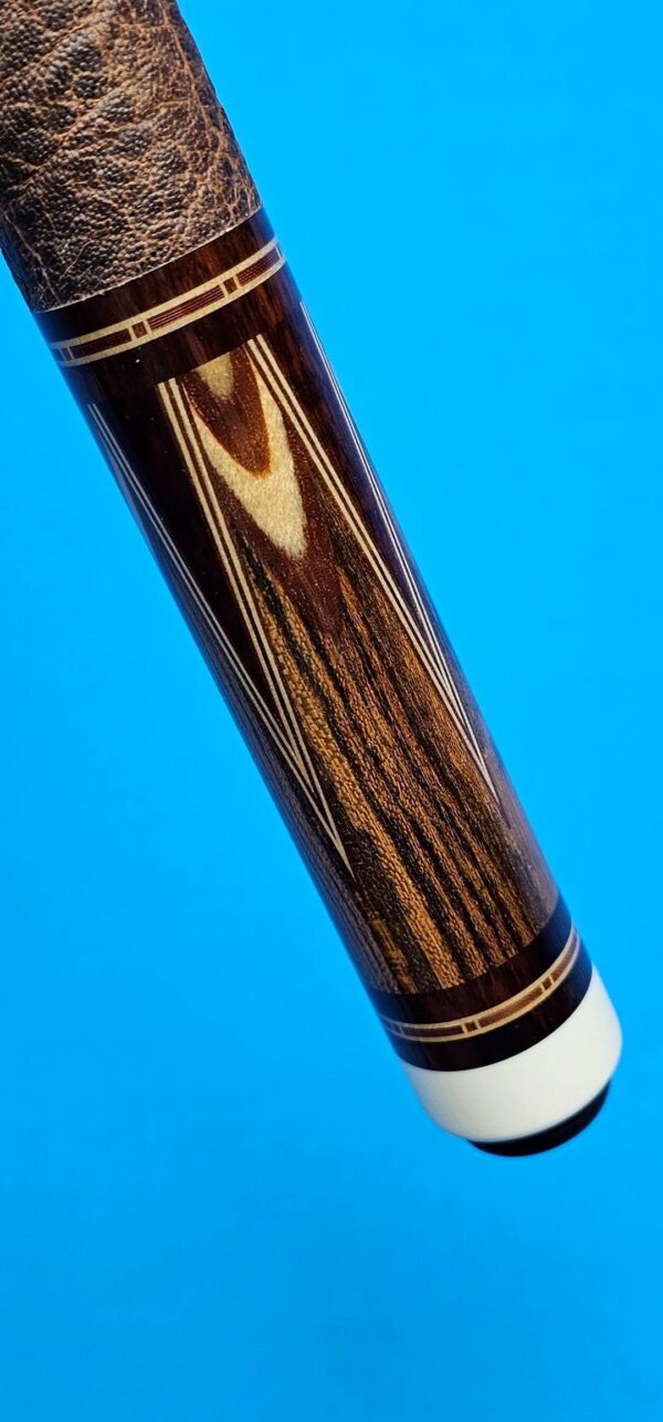 • Rick held on to a hand full of these impressive butt sleeves that his father had built to use in cues for many, many years in the shop! This one consists of Snakewood, Bacote, & Maple! The sharp reversed points also with the design Butterfly’s look awesome!