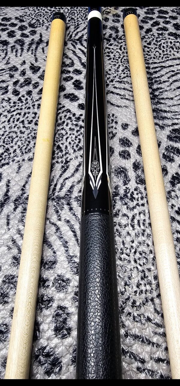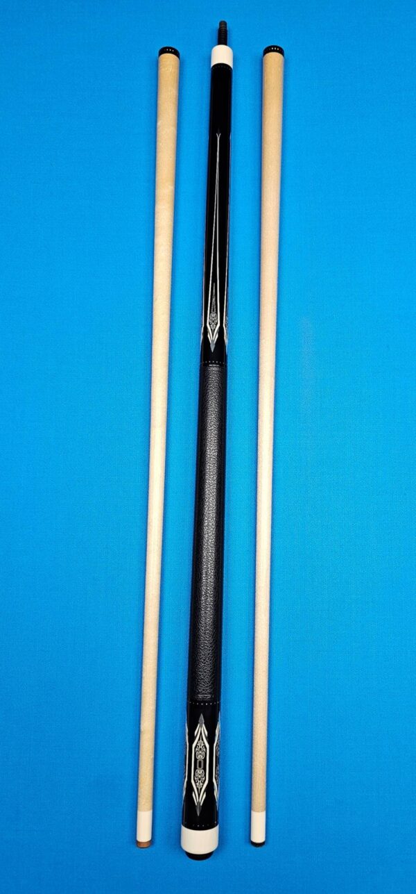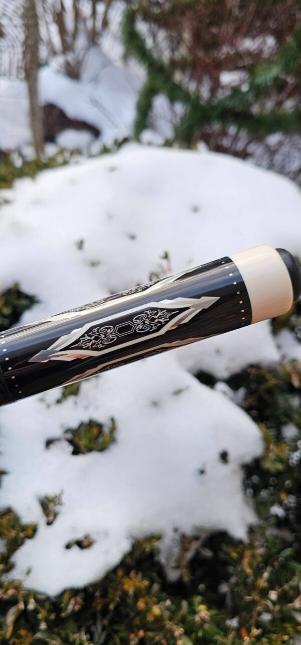 - VERY complex design! Ebony, Silver, & Natural material throughout…….. Pictures do not come close to exemplifying the true beauty of this cue……..